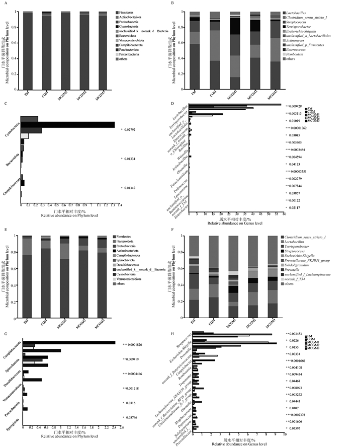 旨在探究不同水平酶解玉米蛋白粉(enzymatic corn gluten meal, MCGM)对断奶仔猪生长性能、肠道屏障、消化酶活性和肠道微生物组成的影响。试验选取240头体重为(5.71±0.79) kg的健康断奶仔猪(21日龄,杜×长×大),基于体重接近原则,随机分配至5个试验组:5%普通玉米蛋白粉(corn gluten meal, CGM)组,5%鱼粉(fish meal, FM)组以及5%、10%和15%酶解玉米蛋白粉组(MCGM1、MCGM2和MCGM3),进行为期14 d的饲养试验。结果显示:1)MCGM1和FM组断奶仔猪的料重比(F/G)显著小于CGM、MCGM2和MCGM3组(P<0.05),MCGM2组粪便评分显著高于其他试验组(P<0.05)。2)与CGM、MCGM2和MCGM3组相比,MCGM1和FM组的十二指肠和空肠的胰蛋白酶和糜蛋白酶的活性显著提高(P<0.05)。3)MCGM1和MCGM3组的十二指肠绒毛高度/隐窝深度(绒隐比)极显著高于CGM组和FM组(P<0.05)。同时,与MCGM2和MCGM3组相比,MCGM1组的肠道屏障基因(Occludin和ZO-1)表达水平显著升高(P<0.05)。4)MCGM1组仔猪回肠特征菌为f__Peptostreptococcaceae、o__Peptostreptococcales-Tissierellales和g__Terrisporobacter,盲肠中为o__Veillonellales-Selenomonadales;FM组仔猪回肠特征菌为g__Lactobacillus和g__Prevotella。综上所述,添加5%的MCGM可以显著提高断奶仔猪十二指肠和空肠的消化酶活性,并能增强肠道屏障功能,进而改善生长性能。