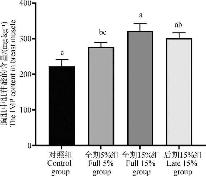 旨在评估构树叶不同添加量和不同添加时间对黄羽肉鸡生产性能和肉品质的影响。选择1日龄黄羽肉鸡360只,随机分成4个处理组,每个处理组6个重复;4个处理组分别全期(1~63日龄)饲喂玉米豆粕型基础日粮(对照组)、全期饲喂5%构树叶日粮(全期5%组)和15%构树叶日粮(全期15%组),以及后期(36~63日龄)饲喂15%构树叶日粮(后期15%组)。结果发现,与对照组相比,全期5%和15%组黄羽肉鸡的体重和日增重显著降低(P < 0.05),料重比显著提高(P < 0.05),而后期15%组黄羽肉鸡的生产性能与对照组差异不显著(P>0.05);与对照组相比,三个构树叶处理组黄羽肉鸡胸肌和腿部皮肤的黄度值(b*)显著提高(P < 0.05),胸肌pH、滴水损失和剪切力无显著差异(P>0.05);与对照组相比,构树叶处理组黄羽肉鸡胸肌中单不饱和脂肪酸的比例显著降低,多不饱和脂肪酸的比例显著提高(P < 0.05),胸肌中的蛋白质和氨基酸含量无显著差异(P>0.05);另外,全期和后期饲喂15%构树叶均显著提高了黄羽肉鸡胸肌中肌苷酸的含量(P < 0.05)。综上所述,后期饲喂15%构树叶对黄羽肉鸡的生产性能无显著影响,可提高黄羽肉鸡皮肤的黄度值,提高胸肌中多不饱和脂肪酸的比例和肌苷酸含量,对肌肉品质有一定的改善作用。