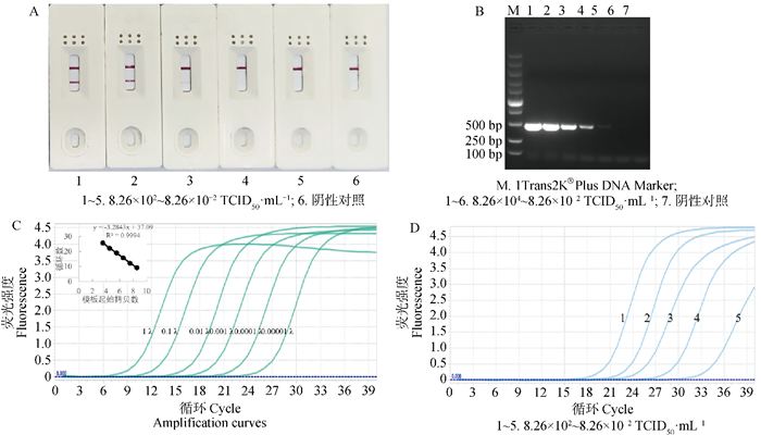 鸡传染性支气管炎是由鸡传染性支气管炎病毒(IBV)感染引起的鸡的一种急性、高度传染性的病毒性呼吸道疾病。为建立一种适合现场化检测IBV的方法,本研究靶向IBV的保守基因M设计引物及探针,结合RPA与胶体金技术,创制了一种能在1 h内出结果的检测IBV的RPA-胶体金试纸条方法。特异性检测证明,该RPA-试纸条方法仅能检测出IBV,而不与禽流感病毒(AIV)、鸡传染性法氏囊病毒(IBDV)、新城疫病毒(NDV)、禽白血病病毒(ALV)和鹅星状病毒(GAstV)等反应。灵敏度检测证明,该RPA-试纸条方法的最低检测限为8.26 TCID50·mL-1。对31份临床样本的比对检测表明,本RPA-试纸条方法、qPCR以及常规PCR的检测阳性率分别为74.2%、64.5%与54.8%。综上,本研究建立的RPA-试纸条快速检测IBV的方法特异性强、敏感性高、操作便捷,为IBV高效诊断及其免疫防控提供了新方法。