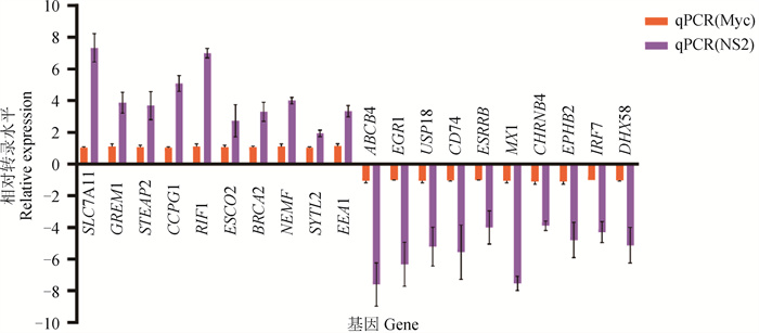 旨在研究FCV NS2蛋白与宿主细胞之间的相互关系。本研究用FCV的NS2真核表达质粒转染CRFK细胞同时设立空载体转染对照组,每组各三个样本于转染后24 h收样进行转录组测序。结果显示:通过比较两组测序结果,发现转染NS2蛋白的试验组细胞存在218个差异表达基因,其中上调基因200个下调基因18个。通过GO富集分析和KEGG富集分析,发现显著差异基因主要集中病毒胞内入侵和免疫逃逸相关信号通路。本研究揭示NS2蛋白对CRFK细胞的内体转运、TGF-β和RIG-Ⅰ等多个信号通路在转录水平具有明显的调控作用,系统性揭示FCV NS2蛋白对宿主细胞整体转录调控模式,为后期研究FCV与宿主细胞互作提供了新的研究思路。