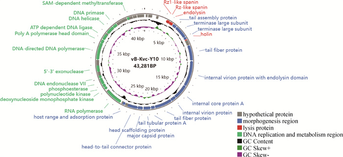 旨在对1株分离出的变栖克雷伯菌噬菌体进行生物学特性及全基因组分析。使用双层平板法从四川省某奶牛场乳样中分离、纯化出1株裂解性噬菌体,测定其裂解谱、热稳定性、酸碱耐受度、最佳感染复数及一步生长曲线等生物学特性,并进行全基因组分析, 同时采用透射电镜观察噬菌体形态。结果显示,分离得到一株裂解性变栖克雷伯噬菌体vB-Kvc-Y10,噬菌斑透明且有晕环,透射电镜显示其有一丝状短尾。生物学研究结果表明,噬菌体Y10宿主特异性强,不耐高温,不耐酸,最佳感染复数为0.01。一步生长曲线结果显示:潜伏期为40 min,裂解量306。全基因组分析表明:噬菌体Y10属于自复制短尾噬菌体科,为dsDNA病毒。完整基因组大小为43 281 bp,GC含量为56.19%,51个ORFs中有29个具有可推定的功能,且具有明显的功能分区。在Y10基因组中,没有发现tRNA和毒力基因的存在。遗传进化树和ANI分析均表明,噬菌体Y10与噬菌体vB_Kpl_K59PH2(登录号:OY757063)的亲缘关系最近。综上,本研究分离的噬菌体vB-Kvc-Y10是一株高特异性的裂解性噬菌体,不具有毒力基因,具有防治细菌感染的潜力。