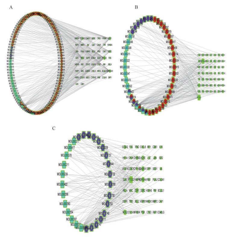 The aim of this study is exploring the mechanism of Yupingfeng oral liquid combined Maxingshigan oral liquid and Shuanghuanglian oral liquid to treat avian respiratory tract infection via network pharmacology, and screen potential anti-IBV drugs by molecular docking technique, as well verifying the anti-IBV activity of Luteolin. The blood entry components and potential targets in three traditional Chinese medicine compounds were retrieved in TCMSP and Uniprot database. The related targets of diseases (respiratory tract infection) were discovered in DrugBank, GeneCards, OMIM and PharmGkb databases, the DAVID database was used to analyze the GO enrichment and KEGG pathway annotation. Then, the key compounds were docked with IBV-nsp9, S1 and main proteases (Mpro) by PDBQT and AutoDock vina software. The anti-IBV activity of Luteolin was validated in Vero cell. The result exhibited that Baicalein, Phillygenin, Luteolin, Formononetin, Kaempferol and Quercetin in three traditional Chinese medicine prescriptions might play a role in the treatment of avian respiratory tract infection through key targets such as FN1, IL6 and PTGS2. Molecular docking result indicated that Phillygenin, Kaempferol, Glycyrrhizin, Luteolin, Quercetin and Isovitexin showed the strongest binding ability with IBV-nsp9, S1 and Mpro. The effect of Luteolin inhibiting IBV replication and the number of viral plaques were verified in Vero cell. The study preliminarily revealed the basic pharmacological effects mechanism of three kinds of traditional Chinese medicine combinations in the treatment of avian respiratory tract infection, and confirmed the anti-IBV effect of Luteolin in vitro.