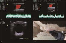 Mammary vein frequency Doppler examination of cows[75] A. Blood flow characteristics of the mammary veins of cows on day 14 of lactation; B. Blood flow characteristics of the mammary veins of cows on day 35 of dry milking; C. Distance, diameter, and cross-sectional area of the mammary veins from the surface of the skin; D. Mammary localization position of the Doppler imaging probe"