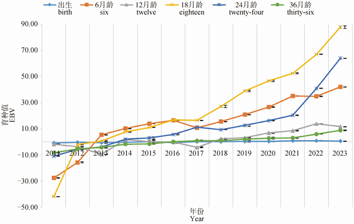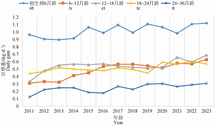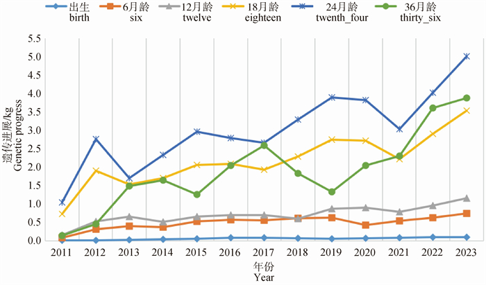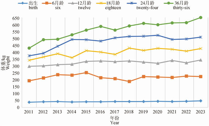 | 参数 Item  |  初生重/kg Birth weight  |  初生到6月龄日增重/(kg·d-1) DG from birth to six months  |  6月龄重/kg Six months weight | 6~12月龄日增重/(kg·d-1) DG from six to twelve months  |  12月龄重/kg Twelve months weight | 12~18月龄日增重/(kg·d-1) DG from twelve to eighteen months  |  18月龄重/kg Eighteen months weight | 18~24月龄日增重/(kg·d-1) DG from eighteen to twenty-four months  |  24月龄重/kg Twenty-four months weight | 24~36月龄日增重/(kg·d-1) DG from twenty-four to thirty-six months  |  36月龄重/kg Thirty-six months weight |