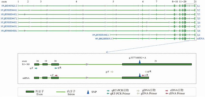 The splice structure of the bovine FOXP2 gene and the location of primers The bovine FOXP2 gene structure of the mRNA and 8 predicted splice variants (X1-X8) sequences. Green, yellow and red arrows indicate primers used for analysis of gene expression levels, SNP identification and allelic expression. The SNP of g.53771685G > A on the last exon is located in the common sequence of all FOXP2 splices"