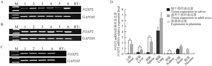 The expression of FOXP2 gene in bovine tissues and placentas A. The expression of bovine FOXP2 gene in calf tissues. B. The expression of bovine FOXP2 gene in adult bovine tissues: 1-6. Heart, liver, spleen, lung, kidney and brain. C. The expression of bovine FOXP2 gene in bovine placenta: 1-4. RT-PCR products obtained from different placentas; M. DL2000 DNA Marker; RT-. Negative control. D. The expression levels of bovine FOXP2 gene in tissues and placentas: *. P < 0.05 represents significant difference; **. P < 0.01 represents extremely significant difference"