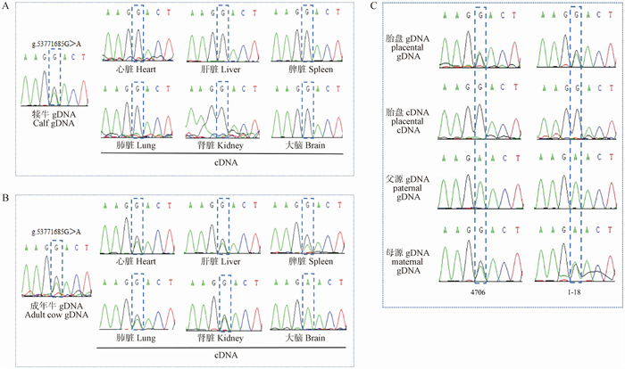 The allelic expression analysis of FOXP2 gene in bovine tissues and placentas A. The allelic expression of FOXP2 gene in calf tissues; B. The allelic expression of FOXP2 gene in adult bovine tissues; C. Imprinting analysis of FOXP2 gene in placentas. The SNP is indicated with the dashed box"