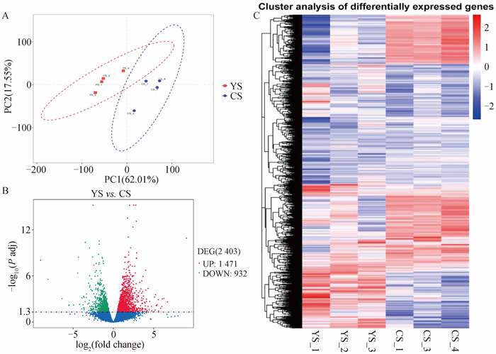 Results of transcriptome analysis of silver fox and red fox A. PCA analysis of the two sample groups: YS represents the silver black fox group, and CS represents the red fox group; B. Volcano plot of DEGs in the YS group vs. CS group; C. Clustered heatmap of DEGs: the x-axis indicates sample names, and the y-axis indicates DEGs. Different colors represent different gene expression levels, where red indicates highly expressed genes and blue indicates lowly expressed genes"