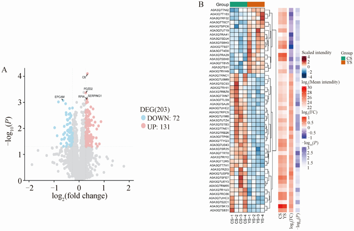 Proteomics analysis results A. Volcano plot of DEPs in YS vs. CS groups; B.Clustering heatmap of DEPs: x-axis represents sample names, y-axis represents DEPs. Different colors indicate protein expression levels, with darker colors showing higher expression and lighter colors showing lower expression"
