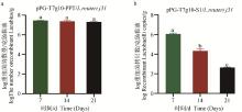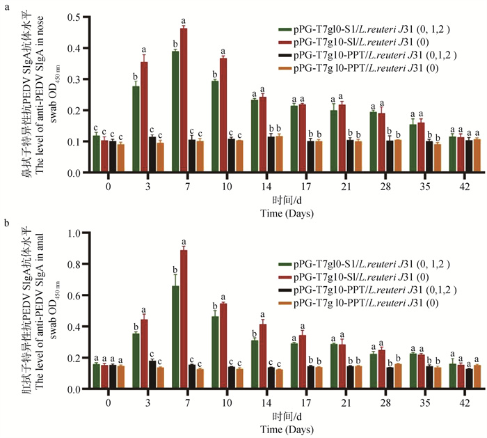 Colonization ability of recombinant Limosilactobacillus reuteri in pig jejunal a. The number of recombinant Limosilactobacillus reuteri in the jejunal mucosa samples; b. Recombinant Limosilactobacillus reuteri copy number in the jejunal mucosa. Different letters indicate significant differences (P < 0.05) at the same time point"