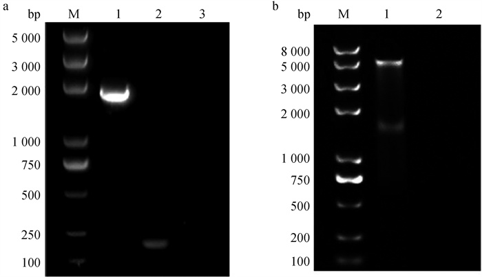 Identification of recombinant plasmid pPG-T7g10-S1 a. PCR identification results of pPG-T7g10-S1 plasmid (1. PCR products of the S1 gene; 2. Empty vector; 3.Negative control); b. Double enzyme digestion results of pPG-T7g10-S1 plasmid (1. Double digestion using SacⅠ and ApaⅠ enzymes; 2. Empty vector)"