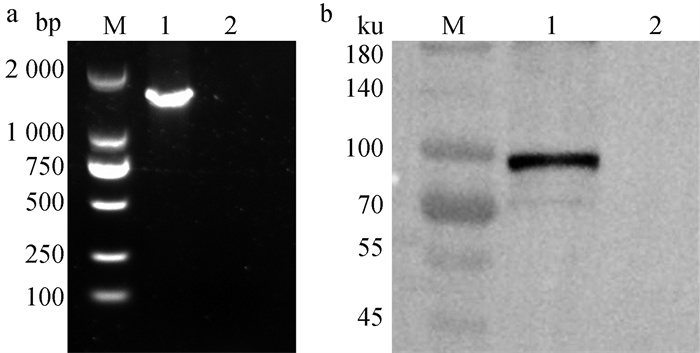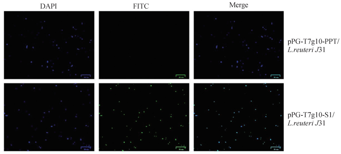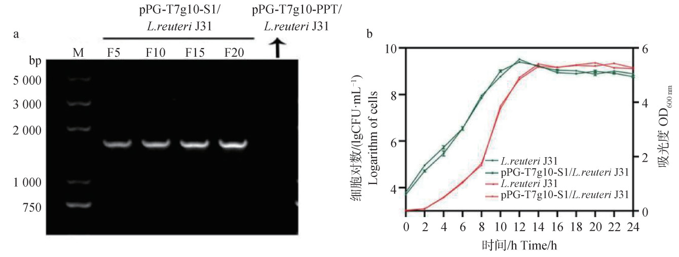 Identification of PCR and Western blot of recombinant bacterium pPG-T7g10-S1/L. reuteri J31 a. Identification of PCR of recombinant bacterium pPG-T7g10-S1/L. reuteri J 31 (1. pPG-T7g10-S1/L.reuteri J 31; 2. pPG-T7g10-PPT/L. reuteri J 31); b. Identification of Western blot of recombinant bacterium pPG-T7g10-S1/L. reuteri J 31 (1. Precipitation of recombinant bacterium pPG-T7g10-S1/L.reuteri J 31; 2. pPG-T7g10-PPT/L. reuteri J 31 cell precipitation)"