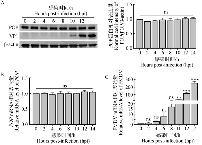 Impact of FMDV infection on POP expression in PK15 Cells A. Detection of POP protein expression in PK15 cells after FMDV infection by Western blot; B. Quantification of POP mRNA expression in PK15 cells after FMDV infection using RT-qPCR; C. Quantification of FMDV mRNA level in PK15 cells after FMDV infection using RT-qPCR. ns. P>0.05; **. P < 0.01; ***. P < 0.001"