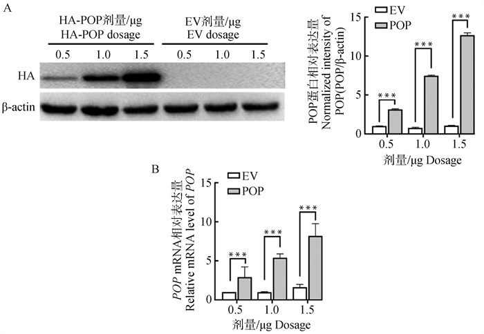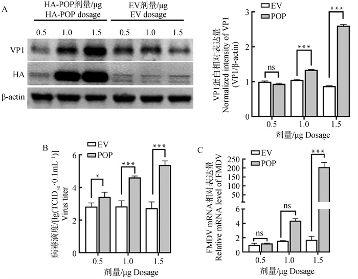 Enhancement of FMDV replication in PK15 cells by overexpression of POP protein A. Dose-dependent effect of POP overexpression on the expression level of FMDV VP1 protein detected by Western blot; B. Detection of viral titers infected with FMDV after POP protein overexpression in PK15 cells; C. Quantification of FMDV mRNA level after overexpression of POP protein in PK15 cells using RT-qPCR. ns. P>0.05; *.P < 0.05; ***. P < 0.001"