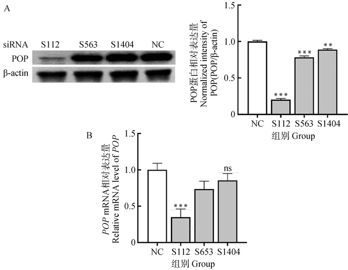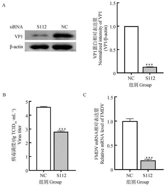 Effect of interfering with POP endogenous expression on the replication of FMDV in PK15 cells A. Detection of FMDV VP1 protein expression by Western blot after transfected siRNA in PK15 cells; B. Detection of viral titers after POP knockdown expression in PK15 cells; C. Quantification of FMDV mRNA level after transfected siRNA in PK15 cells using RT-qPCR. ***. P < 0.001"