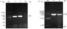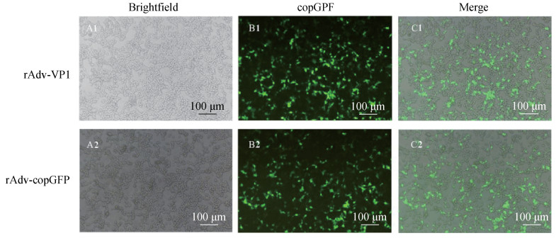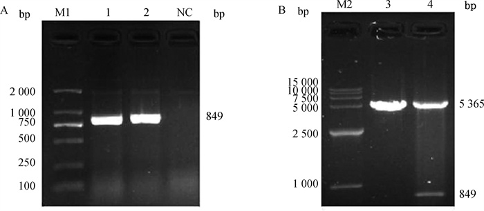 Identification of recombinant adenovirus shuttle plasmid pDC316-VP1-copGFP A. Identification of adenovirus shuttle plasmid pDC316-VP1-copGFP; B. Identification of recombinant plasmid pDC316-VP1-copGFP by double restriction enzyme digestion; M1. DNA marker 2 000; 1-2. pDC316-VP1-copGFP plasmid identification; NC. Negative control; M2. D15000 molecular weight standard; 3. Positive plasmid control; 4. Enzymatically cleaved recombinant plasmid pDC316-VP1-copGFP"