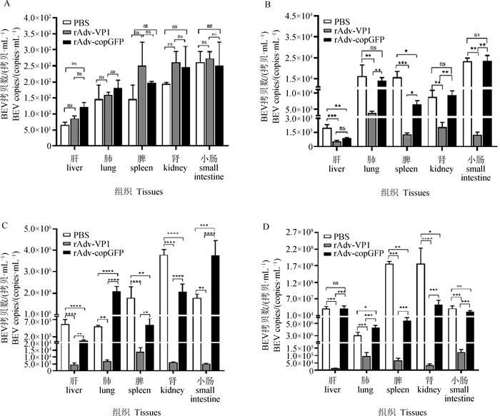 Detection of viral load in different tissues at different times after BEV infection in mice A-D. Viral load on day 0-15 post BEV challenge (A. Day 0; B. Day 5; C. Day 10; D. Day 15); *. P < 0.05; **. P < 0.01; ***. P < 0.01; ****. P < 0.0001; ns. Non statistical significance (the same below)"