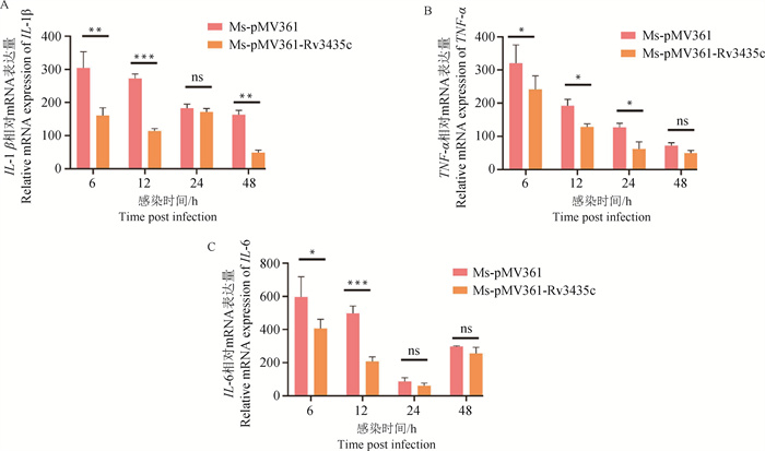 The mRNA expression levels of IL-1β, TNF-α, and IL-6 in cells infected with the recombinant strain at 6, 12, 24, and 48 hours post-infection mRNA expression levels of cytokines in Ms-pMV361, Ms-pMV361-Rv3435c infected RAW264.7 cells at 6, 12, 24, and 48 h(*. P < 0.05; **. P < 0.01; ***. P < 0.001; ns. P>0.05). A. IL-1β; B. TNF-α; C. IL-6"
