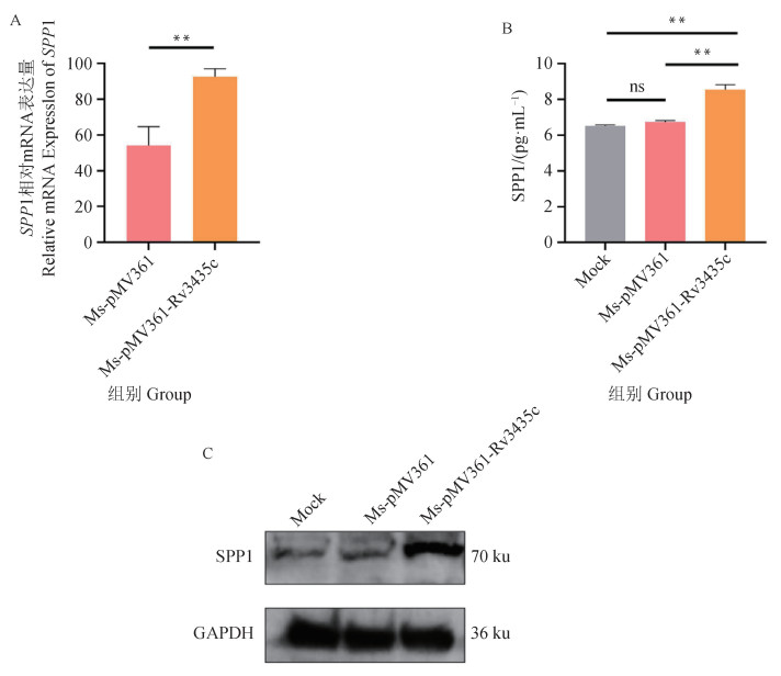 SPP1 as a potential target for the function of Rv3435c A. Spp1 mRNA expression of recombinant strain 12 hours after infection; B. SPP1 secretion of recombinant strain 12 hours after infection; C. SPP1 protein level 12 h after infection by the recombinant strain.*.P < 0.05; **. P < 0.01; ***. P < 0.001; ns. P>0.05"