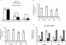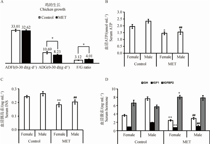 Effects of MET on chicken growth and growth-related hormones A. Effect of MET on chicken growth (ADFI. average daily feed intake; AGD. average daily gain; F/G ratio. feed/gain ratio; Data are expressed as "$\bar x \pm s$" (n=4, 40 chicks per group), *. P < 0.05 compared with the control group, according to the t test); B. Serum ATP level; C. Serum insulin (INS) level; D. Serum levels of growth hormone (GH), insulin-like growth factor 1 (IGF1), and insulin-like growth factor binding protein 2 (IGFBP2); in Fig. B-D, data are represented as "$\bar x \pm s$" (n=6 per group), *.P < 0.05 for the female treatment group compared with the female control group, **.P < 0.01 for the female treatment group compared with the female control group; #. P < 0.05 for the male treatment group compared with the male control group, ##. P < 0.01 for the male treatment group compared with the male control group, according to the t test"