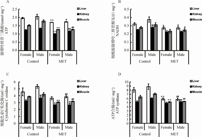 Effects of MET on ATP level and mitochondrial respiratory enzymes in the liver, kidney, and muscle of chicks A. ATP level; B. Nicotinamide adenine dinucleotide hydrogen (NADH) concentration; C. Cytochrome C oxidase activity; D. ATP synthase activity; Data are represented as "$\bar x \pm s$" (n=6 per group), *. P < 0.05 for the female treatment group compared with the female control group, **. P < 0.01 for the female treatment group compared with the female control group; #. P < 0.05 for the male treatment group compared with the male control group, ##. P < 0.01 for the male treatment group compared with the male control group, according to the t test"