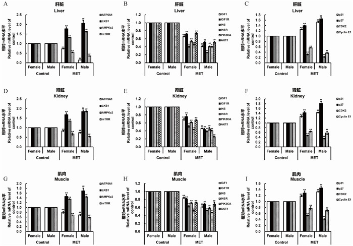 Effects of MET on mRNA levels of genes related to growth metabolism in the liver, kidney, and muscle of chicks A. Relative mRNA levels of ATP synthase F1 subunit α (ATP5A1), liver kinase B1 (LKB1), AMP-activated protein kinase α2 (AMPKα2), and mammalian target of rapamycin (mTOR) in the liver; B. Relative mRNA levels of insulin-like growth factor 1 (IGF1), insulin-like growth factor 1 receptor (IGF1R), insulin (INS), insulin receptor (INSR), phosphatidylinositol-4, 5-bisphosphate 3-kinase catalytic subunit alpha (PIK3CA), and AKT serine/threonine kinase 1 (AKT1) in the liver; C. Relative mRNA levels of p21, p27, Cyclin-dependent kinase 2 (CDK2), and Cyclin E1 in the liver; D-F and G-I show relative mRNA levels of the above genes in the kidney and muscle respectively; Data are represented as "$\bar x \pm s$"(n=3 per group), *. P < 0.05 for the female treatment group compared with the female control group, **. P < 0.01 for the female treatment group compared with the female control group; #. P < 0.05 for the male treatment group compared with the male control group, ##. P < 0.01 for the male treatment group compared with the male control group, according to the t test"