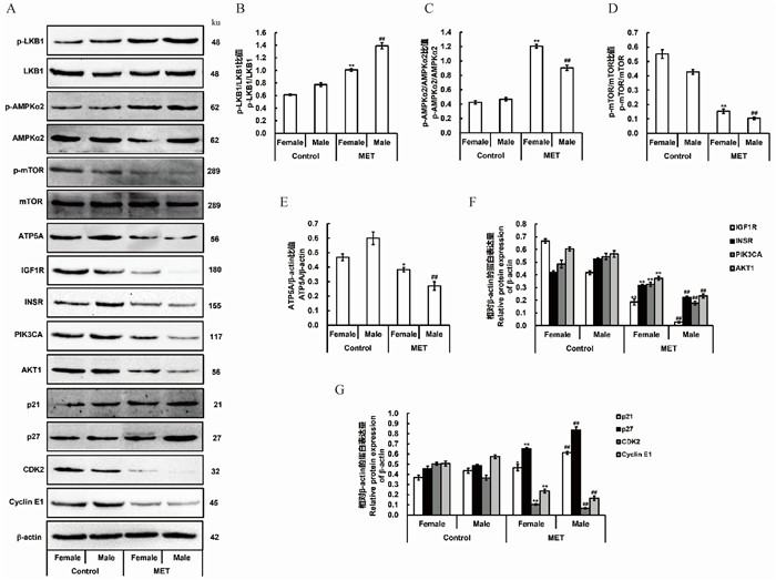 Effects of MET on protein expressions related to growth metabolism in the muscle of chicks A. Western blot analysis of protein bands; B. p-LKB1/LKB1 ration; C. p-AMPKα2/AMPKα2 ration; D. p-mTOR/mTOR ration; E. Relative protein level of ATP5A; F. Relative protein levels of IGF1R, INSR, PIK3CA, and AKT1; G. Relative protein levels of p21, p27, CDK2, and Cyclin E1; Data are represented as "$\bar x \pm s$" (n=3 per group), *. P < 0.05 for the female treatment group compared with the female control group, **. P < 0.01 for the female treatment group compared with the female control group; #. P < 0.05 for the male treatment group compared with the male control group, ##. P < 0.01 for the male treatment group compared with the male control group, according to the t test"