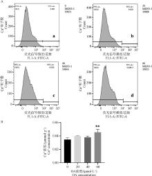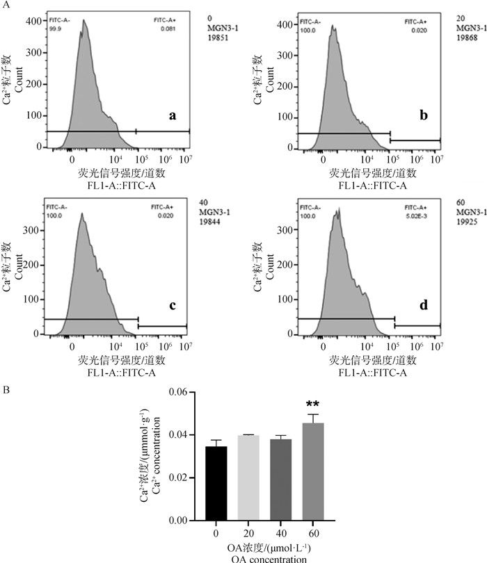 Effect of different concentrations of OA treatment on intracellular Ca2+ concentration in MGN3-1 cells A. Single parameter histogram of Ca2+ fluorescent probe, a shows the control group (0 μmol ·L-1), b shows the low concentration group (20 μmol ·L-1), c shows the medium concentration group (40 μmol ·L-1), d shows the high concentration group (60 μmol ·L-1); B. Changes of Ca2+ concentration"