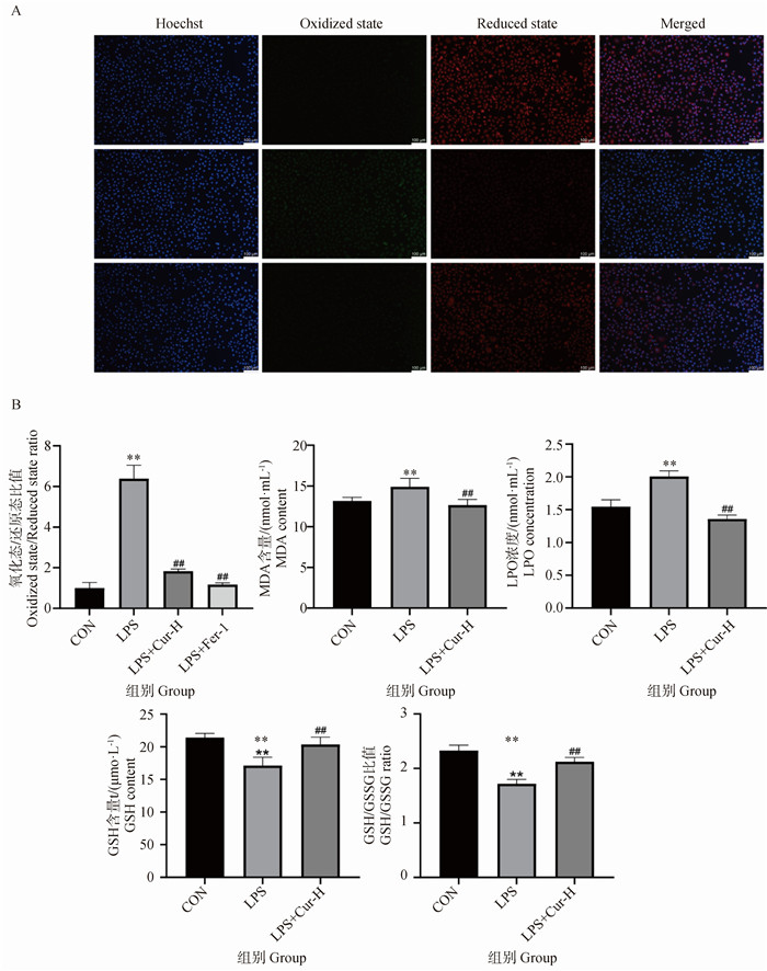 Effect of Cur treatment on lipid peroxidation related indexes in MAC-T cell inflammation model A. Staining with BODIPY 581/591 C11; B. Detection of lipid peroxidation related kits (MDA, LPO, GSH, GSH/GSSG). * indicate significant differences between CON and LPS-treated groups (**. P < 0.01); # indicates significant differences between the LPS treatment group and the LPS+Cur/LPS+Cur+Erastin treatment group (##. P < 0.01)"
