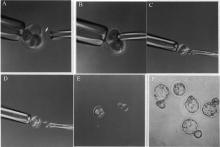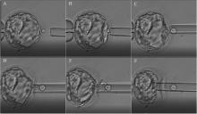 Trophectoderm (TE) biopsy procedure[26] A. Laser pulse (90 μs) applied to create an opening in the zona pellucida; B. Culture medium injected through the opening to expand the perivitelline space; C. Laser irradiation (90-120 μs) enlarges the zona opening while maintaining perivitelline space integrity; D. Medium injected to dislodge TE cells from the inner surface of the zona opening; E. TE cells extruding through the opening; F. Aspiration of extruded TE cells into biopsy pipette upon obtaining sufficient sample volume"