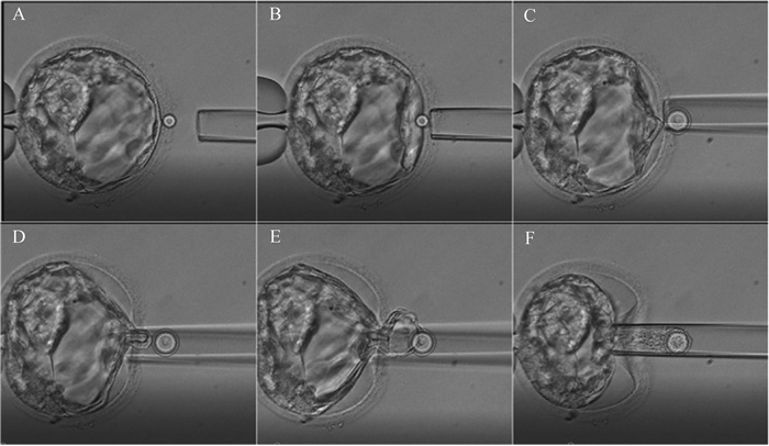 Schematic diagram of blastomere biopsy micromanipulation[20] A. Cleavage-stage embryo immobilized on a holding pipette; B. Biopsy pipette gently positioned within the zona pellucida; B. Gentle aspiration applied to remove the blastomere through the zona pellucida; D. Complete removal of the targeted blastomere; E. Embryo and biopsied blastomere released into the culture medium; F. Post-biopsy embryo developing into a hatching blastocyst"