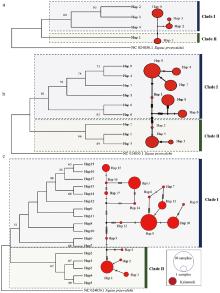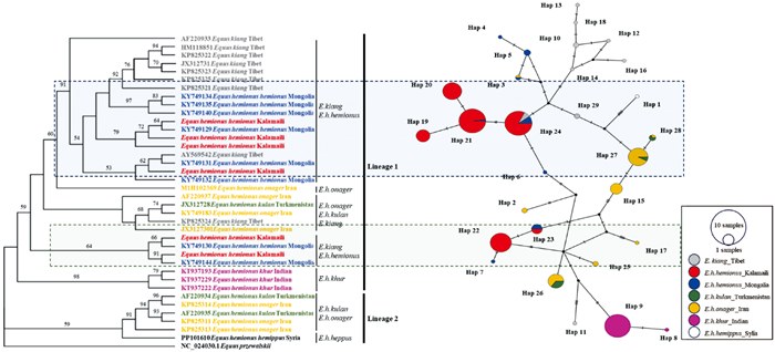 Genetic structure and phylogenetic relationships of the Kalamaili E. h. hemionus population a. Maximum likelihood (ML) phylogenetic tree and haplotype network of Kalamaili population based on CYTBsequences; b. ML phylogenetic tree and haplotype network of Kalamaili population based on D-LOOPsequences; c. ML phylogenetic tree and haplotype network of Kalamaili population based on combined sequences"