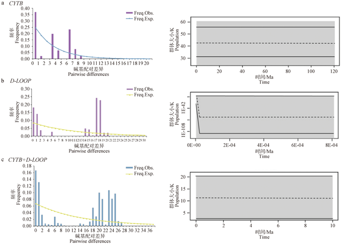 Mismatch distribution and Bayesian skyline plot of the E. h. hemionus population in Kalamaili a. Mismatch distribution and Bayesian skyline plot based on the CYTBgene; b. Mismatch distribution and Bayesian skyline plot based on the D-LOOPgene; c. Mismatch distribution and Bayesian skyline plot based on the combined gene"