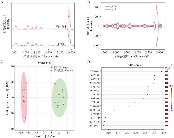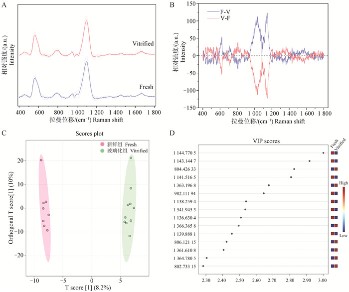 Raman spectra analysis of fresh oocytes and vitrified oocytes A. Average Raman spectra of fresh and vitrified oocytes, with shaded areas representing standard deviation; B. Average difference spectra of fresh and vitrified oocytes; C. OPLS-DA scores of Raman spectra of fresh and vitrified oocytes; D. VIP scores based on OPLS-DA"