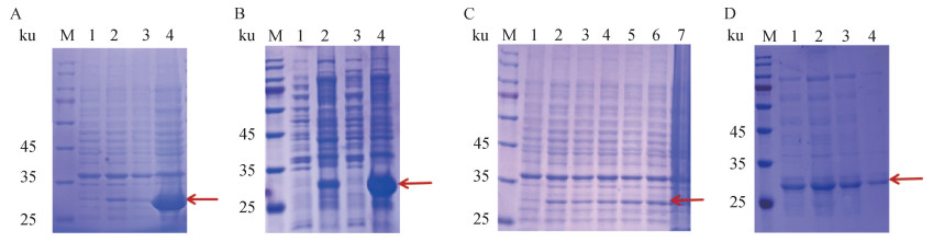 >Optimization of pig 5B CD40L protein expression condition A. Optimization of protein expression temperature (M. Protein molecular weight standard; 1.2. Before and after induction at 16 ℃; 3, 4. Before and after induction at 37 ℃); B. Soluble expression of the target protein (M. Protein molecular weight standard; 1.2. Precipitation and supernatant after ultrasound at 37 ℃; 3, 4. Precipitation and supernatant after ultrasonic treatment at 16 ℃; C. Optimization of inducer IPTG concentration (M. Protein molecular weight standard; 1-7.0, 0.1, 0.2, 0.3, 0.4, 0.5, 0.6 mmol·L-1; D. Optimization of bacterial density OD600 nm value (M. Protein molecular weight standard; The values of 1 to 4.OD600 nm are 1.1, 0.9, 0.7, and 0.5 respectively"