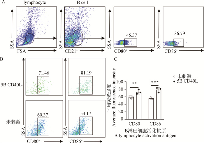 Gate-setting strategy of B cells and detection of 5B CD40L bioactivity in vitro A. B-cell sorting strategy (using the dual parameter characteristics of forward scattering angle (FSC-A) and side scattering angle (SSC-A) to conduct an initial screening of the lymphocyte population, and further identifying B-cell subgroups through anti-CD21 antibody labeling); B. The flow cytometry scatter plot presents the co-expression characteristics of the co-stimulatory molecules CD80 and CD86 on the surface of CD21+ B lymphocytes in the 5B CD40L treatment group; C. Quantitative analysis of five independent experiments showed (n=5), there was a dose-dependent difference in the average fluorescence intensity of CD80/CD86 in CD21+ B lymphocytes of the test group, and the data are presented as the ${\bar x}$±s. ns. No difference, *. P < 0.05, **. P < 0.01, ***. P < 0.001, ****. P < 0.000 1, the same as below"