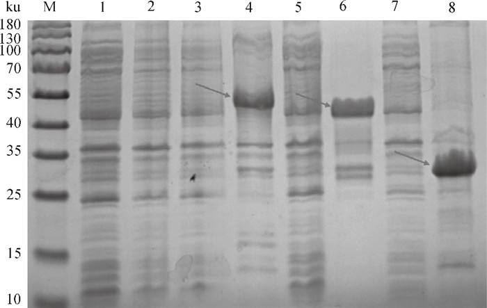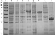 Expression of VP0, VP3 and VPI proteins M. Protein marker; 1. Supernatant of induced pET-30a(+)/BL21 (DE3) after ultrasonic treatment; 2. Precipitate of induced pET-30a(+)/BL21 (DE3) after ultrasonic treatment; 3. Supernatant of induced pET-VP0/BL21 (DE3) after ultrasonic treatment; 4. Precipitate of induced pET-VP0/BL21 (DE3) after ultrasonic treatment; 5. Supernatant of induced pET-VP1/BL21 (DE3) after ultrasonic treatment; 6. Precipitate of induced pET-VP1/BL21 (DE3) after ultrasonic treatment; 7. Supernatant of induced pET-VP3/BL21 (DE3) after ultrasonic treatment; 8. Precipitate of induced pET-VP3/BL21 (DE3) after ultrasonic treatment"
