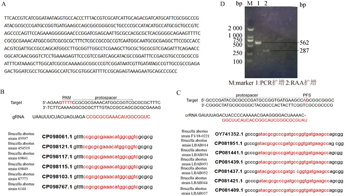 Positive plasmid construction, sgRNA/crRNA design and RAA isothermal amplification primer detection A. Sequence of Standard plasmid. B. Designed sgRNA of AsCas12a-detector for Brucella detection. C. Designed sgRNA of LwaCas13a-detector for Brucella detection. D. RAA isothermal amplification results"