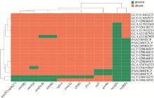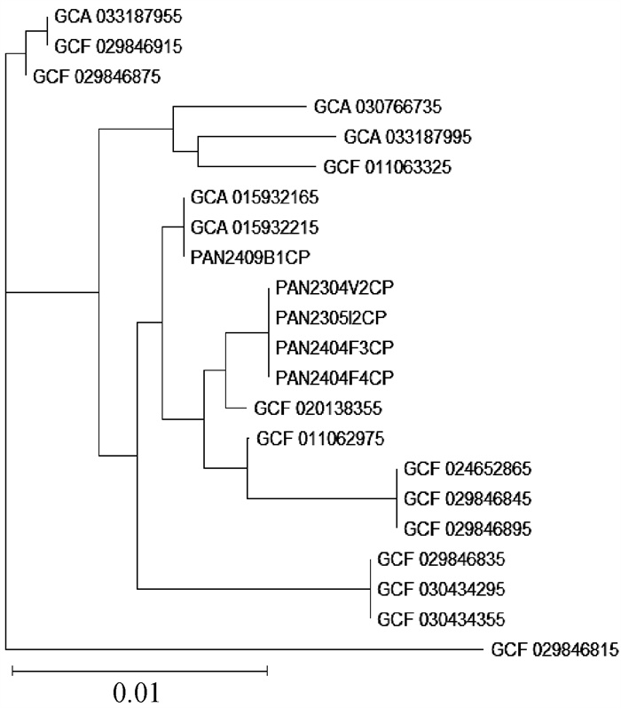 This study aimed to investigate the types of Clostridium perfringens isolated from bovine sources in 10 dairy farms in Hebei and Henan, China, and to investigate the information of five isolates by whole gene sequencing. The isolates were identified using PCR and sequencing techniques from 89 bovine disease cases suspected of having C. perfringens disease collected from large-scale dairy farms nationwide. Combined with the genomes of 17 strains of bovine C. perfringens obtained from NCBI public databases, bioinformatics techniques were used to analyze the isolates for pangenomic, phylogenetic, virulence, and drug-resistance genes. The whole genome sequencing analysis showed that the genome size of the isolates ranged from 2.98 to 3.19 MB, with an average of 60 tRNAs and 2 873 coding regions of genes (CDS) per genome. MLST (multilocus sequence typing) showed that the isolates in this study belonged to a different type from the 17 C. perfringens strains of bovine origin downloaded from NCBI, with the exception of PAN2309B1CP belonged to ST777 type, and the remaining 4 strains belonged to ST72 type. A total of 13 drug resistance genes and 30 virulence factors were detected in 22 strains of C. perfringens of bovine origin, among which the tetracycline resistance gene, tetA(P), had the highest carrier rate of 86.3%. Analysis of the pan-genomic results showed that the 5 isolates in this study contained a total of 7 927 genes, of which the number of core genes was 1647 (21.0%). The analysis of the core genome and plc gene evolution tree showed that PAN2305I2CP, PAN2304V2CP, PAN2404F3CP, and PAN2404F4CP were all in the same branch, and PAN2309B1CP was in another branch. This study is the first case of isolation, identification and bioinformatics analysis of Clostridium perfringens from dairy cows, which further enriches the domestic database of epidemic strains of Clostridium perfringens from dairy cows, as well as its genomic structure, composition and evolutionary information. It also provides reference value for the prevention and treatment of C. perfringens disease and further genomic research.