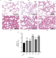Effect of different rewarming times under HS on the histopathological changes in the lung tissue of SD rats A. Representative lung tissue sections were observed for histopathological changes using hematoxylin and eosin (HE) staining (400×); B. Lung injury assessment. n=3, compared with the control group, *. P<0.05, **.P<0.01, ***. P<0.001"