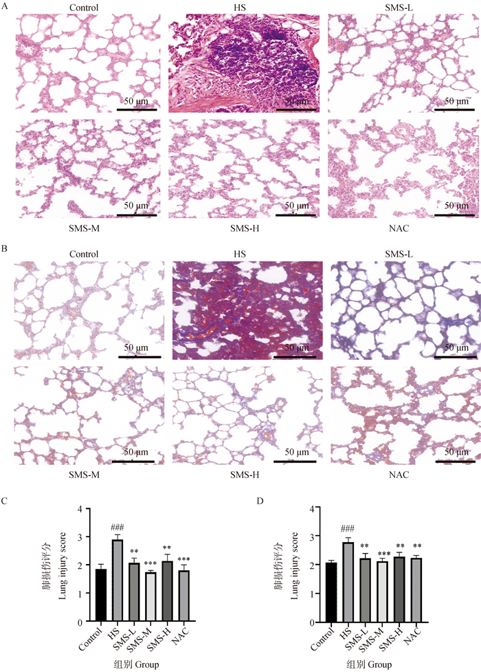 Effect of SMS on HS-induced lung injury A. Effect of SMS on pathological changes in lung injury caused by heat stress; B. Effect of SMS on fibrosis in heat stress-induced lung injury; C. Lung injury assessment (n=3); D. Lung wet-to-dry weight ratio (n=6). Compared with the control group, #. P<0.05, ##. P<0.01, ###. P<0.001, ns. P>0.05; compared with the HS group, *. P<0.05, **. P<0.01, ***. P<0.001, ns. P>0.05, the same as below"