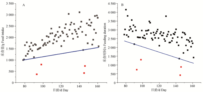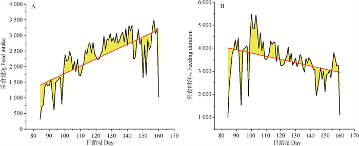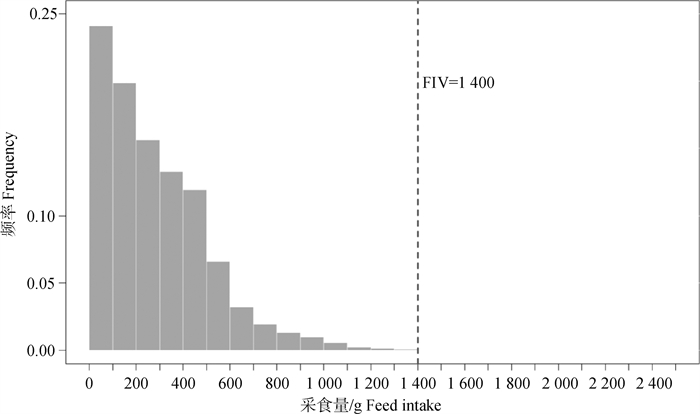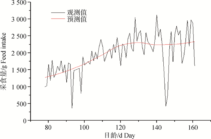 The objective of this study was to estimate and compare genetic parameters of different general resilience traits using longitudinal daily feed intake data of Large White and Landrace pigs. Growth and feed intake records data from 1 692 Large white and Landrace finishing pigs were collected via automatic feeders, and used to analyze average daily gain (ADG), average daily feed intake (ADFI), average daily feeding duration (ADFD), average daily visit times (ADVT) and 8 general resilience traits were analyzed. Daily variability in feed intake (VarFI), daily variability in feeding duration (VarFD), daily variability in visit times (VarVT), the log-transformed variance of deviation for the daily feed intake (LnVar_FI), the log-transformed variance of deviation for the daily feeding duration (LnVar_FD), the log-transformed variance of deviation for the daily visit times (LnVar_VT), off-feed days for corresponding feed intake (OFFFI), and off-feed days for corresponding feeding duration (OFFFD) were calculated as general resilience traits. The heritability and genetic correlation of the above traits were calculated using the single and multiple traits models, respectively. The results showed that the heritability of ADG, ADFI, ADFD and ADVT were 0.25, 0.49, 0.53 and 0.43, respectively. The heritability of general resilience traits VarFI, VarFD, VarVT, LnVar_FI, LnVar_FD, LnVar_VT, OFFFI and OFFFD were 0.33, 0.26, 0.38, 0.39, 0.29, 0.37, 0.14, and 0.16, respectively. The genetic correlation was positive and high between ADG and ADFI with value of 0.83. The genetic correlation between ADG and general resilience traits ranged from -0.85 to 0.83. Specifically, there was a high positive correlation (r=0.83) between both VarFI and ADG and between LnVar_FI and ADG, while a high negative correlation (r=-0.85) was observed between OFFFD and ADG. There was a high negative correlation both between LnVar_FD and ADVT, and between LnVar_VT and ADG, with values of -0.89 and -0.76, respectively. In conclusion, we calculated and compared the genetic parameters of different general resilience traits, and found that the heritability of these general resilience indicators was low to moderate. Among them, LnVar_FI and VarFI exhibited high heritability and high genetic correlations with production traits, and can be considered as evaluation indicators of general resilience traits in pigs for individual selection. The results of this study provide important theoretical basis for the breeding of general disease resistance or resilience-related traits in pigs.