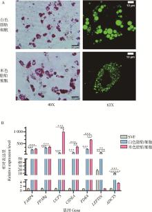Lipid droplet characteristics and mRNA expression levels in white and beige adipocytes A. Oil Red O staining (40×) and BODIPY 493/503 fluorescence staining (63×) of white and beige adipocytes. B. Relative expression levels of known adipocyte marker genes in SVF, white and beige adipocytes. All data is presented as the "mean±SEM", *.P < 0.05, **.P < 0.01, ***.P < 0.001, the same as below"