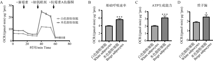 Mitochondrial stress test in white and beige adipocytes A. Comparison of oxygen consumption rate (OCR) between white and beige adipocytes derived from SVF after 8-day differentiation; B-D. The basal respiration rate (B), ATP production (C) and proton leak (D) were calculated based on the OCRs"