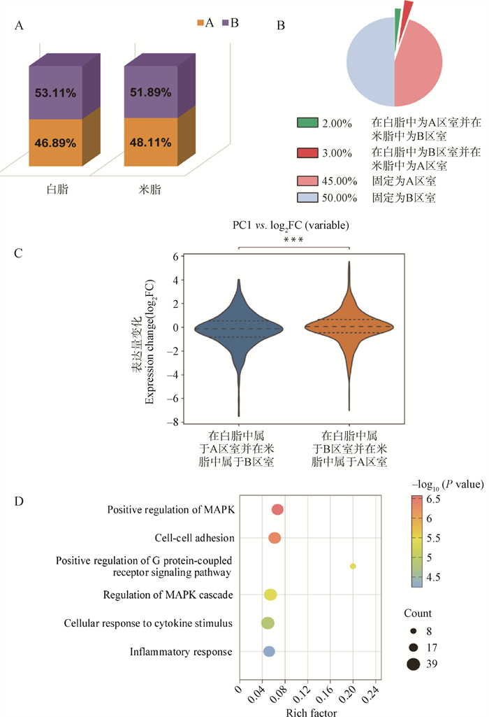 The characteristics of compartment A/B between white and beige adipocytes A. Percentage of compartment A/B in white and beige adipocytes; B. Proportion of chromatin compartments in white versus beige adipocytes; C. Gene expression levels in white versus beige adipocytes across chromatin compartments; D. Functional enrichment analysis of genes transitioning from compartment B in white adipocytes to compartment A in beige adipocytes. P values were determined by Mann-Whitney U test"