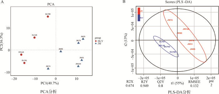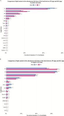 Comparison of lipid content detected in Jinwu pigs and DLY pigs in both positive and negative ion modes A. Comparison of lipid content in the subcutaneous fat tissue of the back between Jinwu pigs and DLY pigs in positive ion mode; B. Comparison of lipid content in the subcutaneous fat tissue of the back between Jinwu pigs and DLY pigs in negative ion mode"