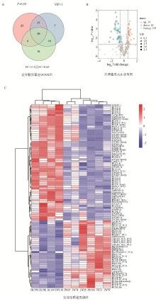Differential lipid molecules between Jinwu pigs and DLY pigs were analyzed using their screening process (Venn diagram), distribution (volcano plot), and clustering pattern (heatmap) A. Venn diagram of 3 screening methods (FC > 1.5 or FC < 0.65, P < 0.05 and VIP > 1); B. Volcano plot of differential lipids, red color represent up regulated lipids, while blue color represent down regulated lipids; C. Heatmap of differential lipids clustering, red color represent up regulated lipids, while blue color represent down regulated lipids"