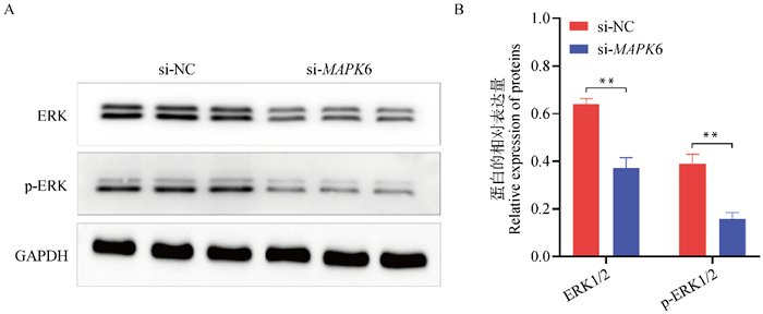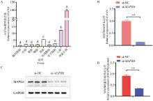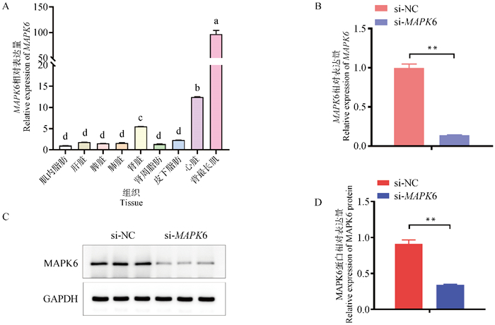 Tissue expression profile and interference efficiency of MAPK6 A. Expression analysis of MAPK6 in various tissues of Qinchuan cattle; B. Interference efficiency of MAPK6; C. The protein expression level of MAPK6; D. Protein grayscale value analysis. Different small letters indicate significant differences, "*" indicates significant difference (P < 0.05), " **" indicates extremely significant difference (P < 0.01), the same as below"