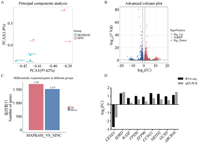 RNA-seq analysis of bovine myoblast differentiation after interfering with the MAPK6 gene A. Principal component analysis of samples; B. Volcano plot of differentially expressed genes; C. Statistics of differentially expressed genes; D. Quantitative validation of differentially expressed genes expression"