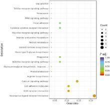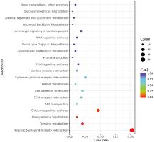 The KEGG pathway enrichment analysis of DEGs related to the eyelid-colobomus trait The scatter diagram showing the KEGG enrichment analysis of the DEGs, the abscissa is the ratio of the number of DEGs annotated to the KEGG pathway to the total number of the DEGs, the ordinate is the KEGG pathways, the sizes of the points represent the number of genes annotated to the KEGG pathway, and the colors from red to purple represent the significant level of enrichment"